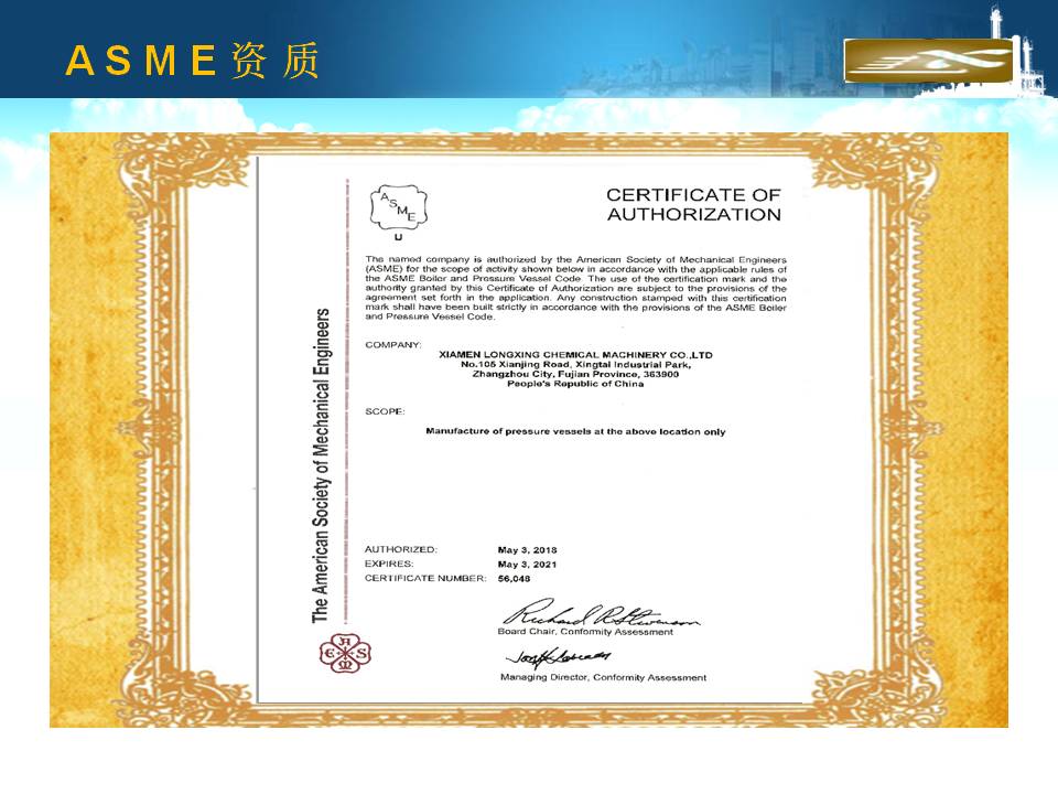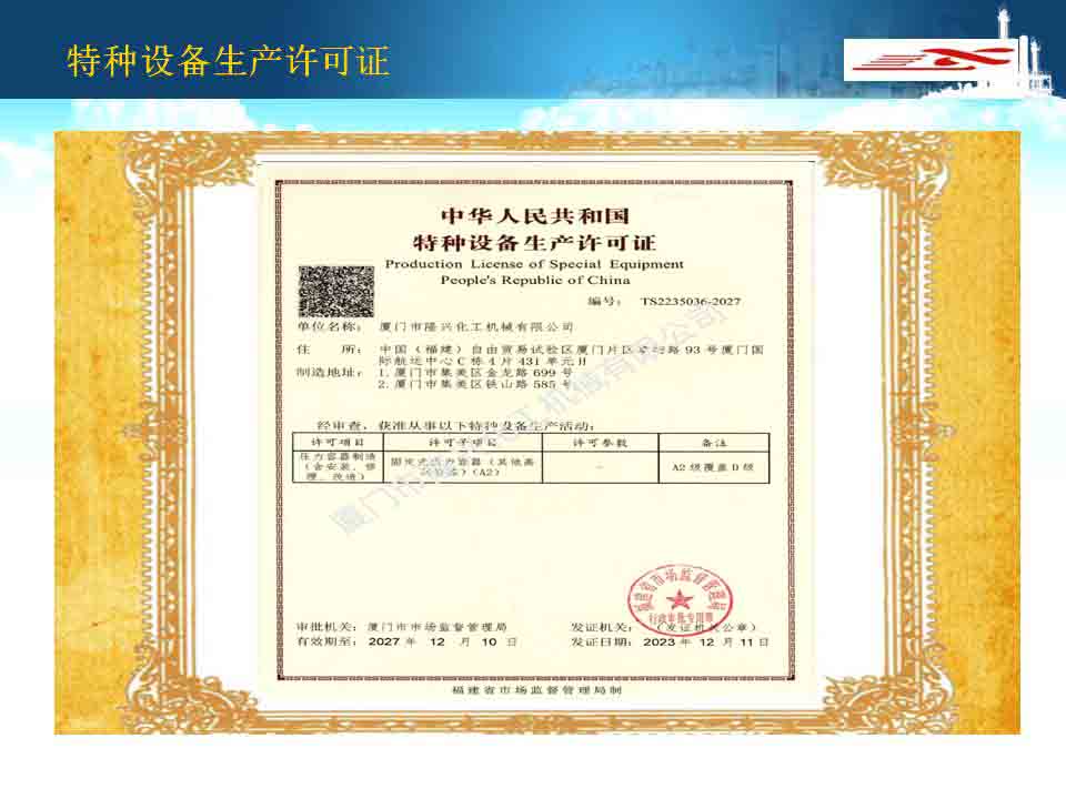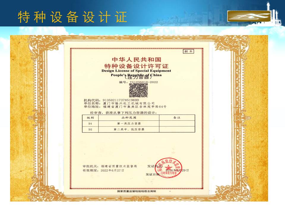 廈門隆興化工機(jī)械有限公司成立于2001年5月,占地面積30000平方米,擁有生產(chǎn)車間面積10000平方米及相關(guān)配套的辦公場所3000平方米,其中下料場所1000平方米,不銹鋼制作場所2000平方米,ASME產(chǎn)品制作區(qū)域1200平方米,無損曝光室30平方米。公司有職工135人,擁有專業(yè)的技術(shù)人員和管理人員36人。公司主要從事設(shè)計、制造A2級覆蓋D類壓力容器...